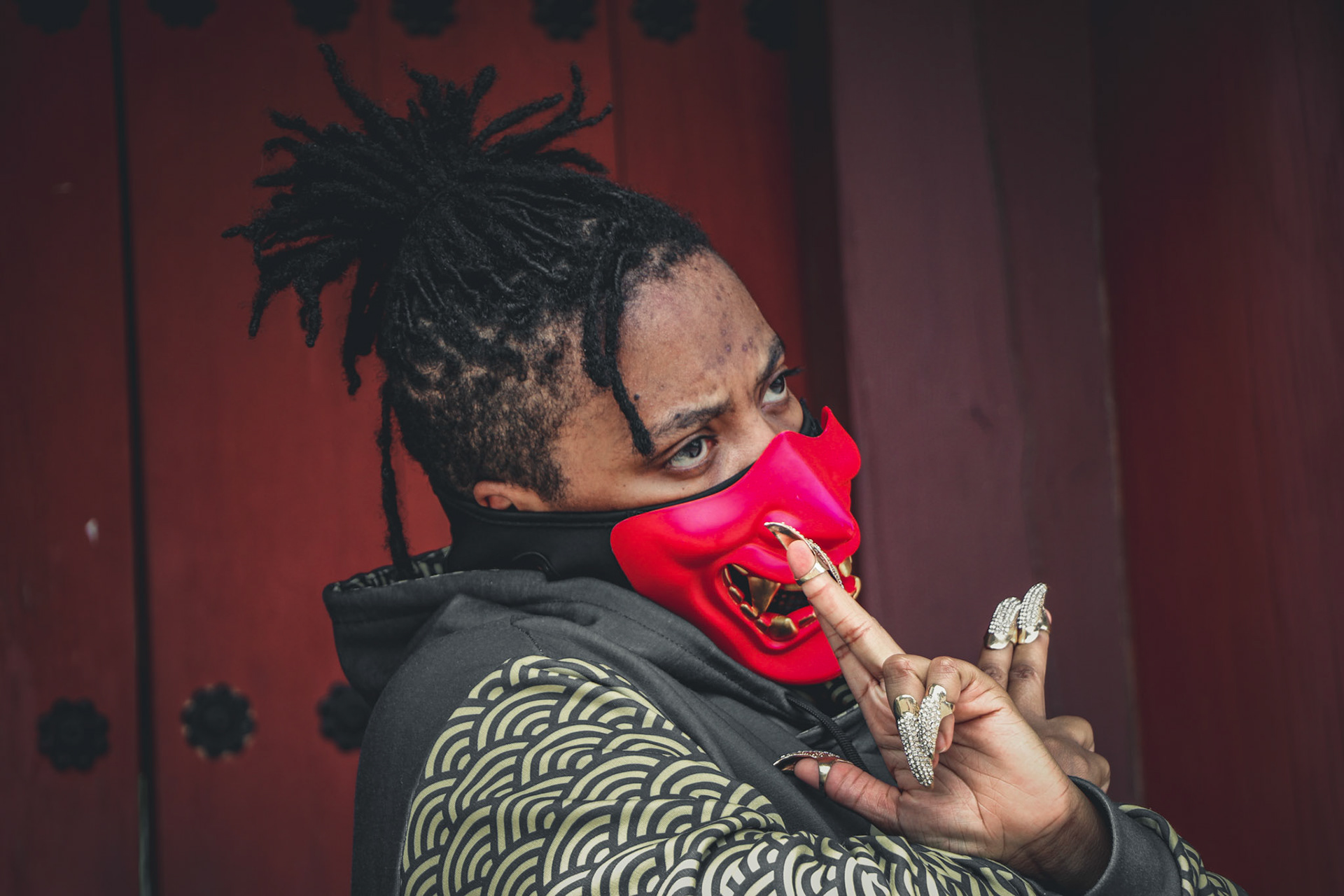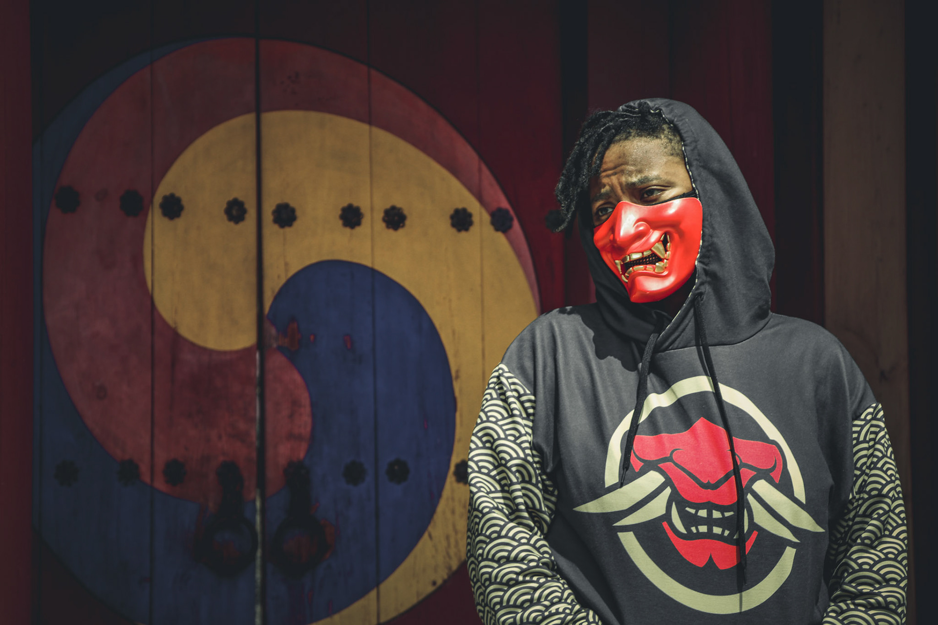 Product showcase for the exclusive Oni Threads Seigaiha Samurai Hoodie featuring the company logo with sleeve design focus on the Japanese pattern seigaiha (wave). PHOTOGRAPHER: Curtis Floyd